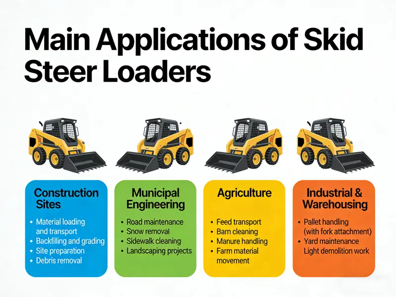 Primarily used for material handling, excavation, loading, and bulldozing. Its key feature is the independent drive via two side tires or tracks, enabling flexible steering and making it suitable for confined spaces and complex terrain. Skid steer loaders have a wide range of applications, including but not limited to the following: