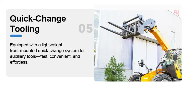 An agricultural telehandler is a versatile piece of equipment used for material handling and loading/unloading on farms. Powered by a hydraulic system, its telescoping boom enables lifting, reaching, and stacking operations. It features a high lifting capacity, a wide operating range, strong off-road capabilities, and compatibility with a variety of interchangeable attachments. Commonly used for agricultural tasks such as handling hay bales, loading and unloading feed, and stacking grain, it effectively improves farm operational efficiency.