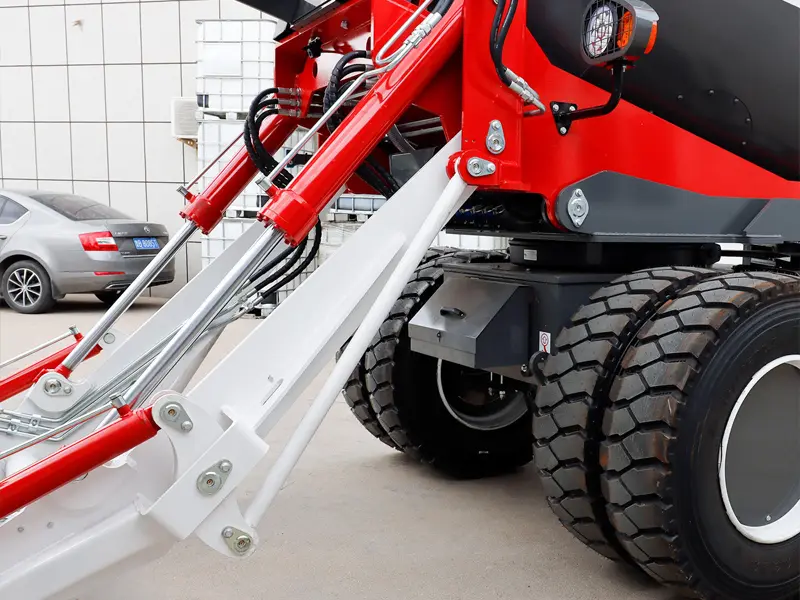 - Hydraulic System: Composed of hydraulic pumps, valves, cylinders, and hoses, controlling actions such as loading bucket operation, mixing drum rotation, unloading, and steering.